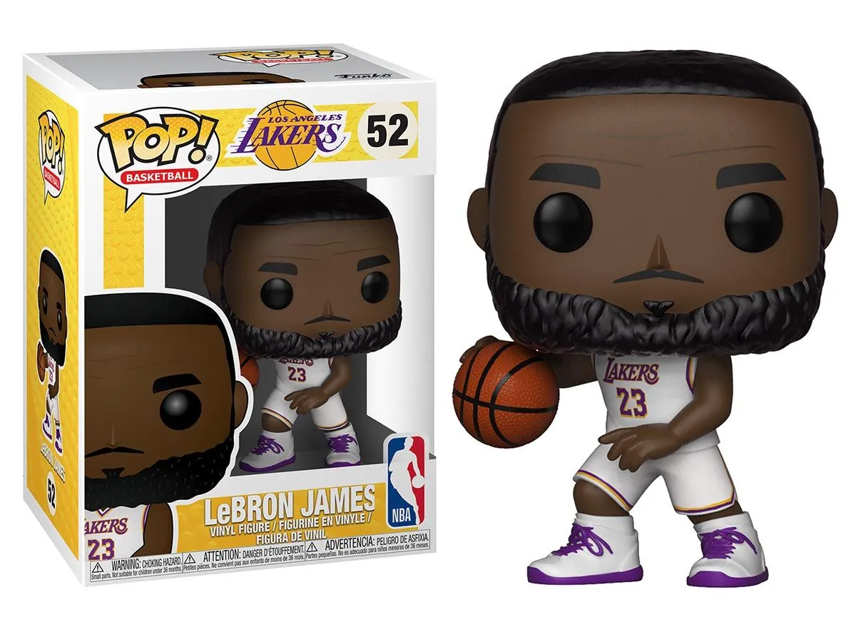 Funko POP! Figur von NBA Basketball Spieler Lebron James bei den Los Angeles Lakers im weißen Auswärtstrikot.