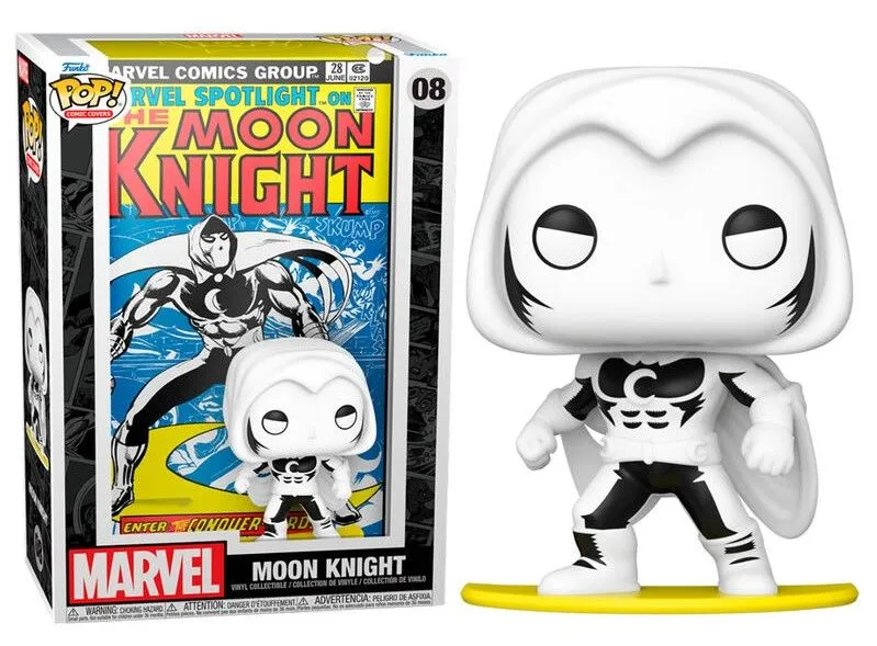 Funko POP! Figur von Marvels Moon Knight mit Comic Cover als Diorama.