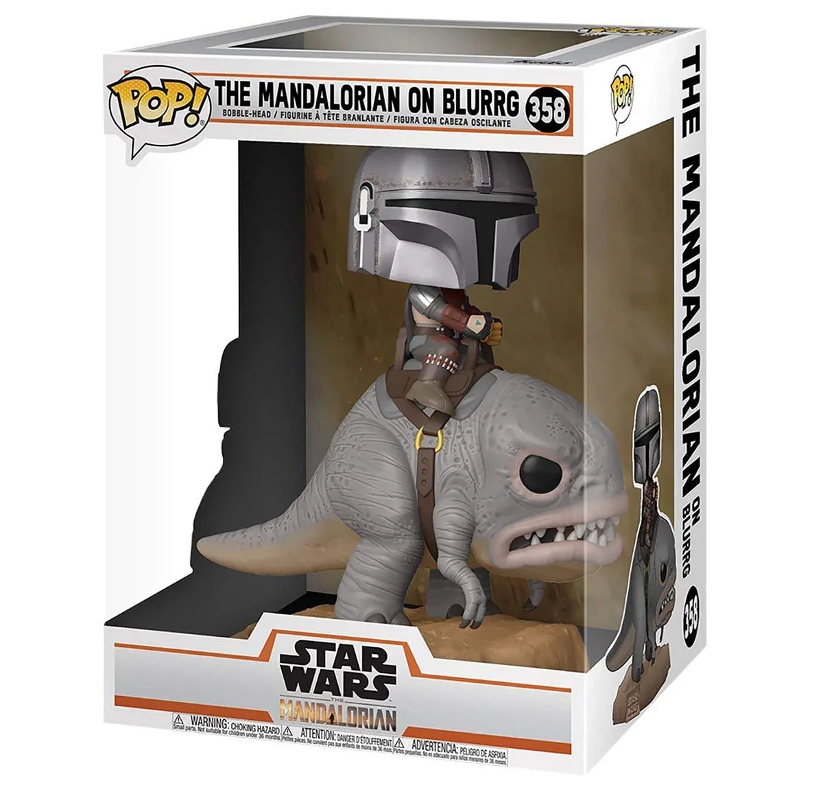 Funko POP! Deluxe Figur von Mando auf dem Reittier Blurrg aus der Disney Star Wars Serie „The Mandalorian“.