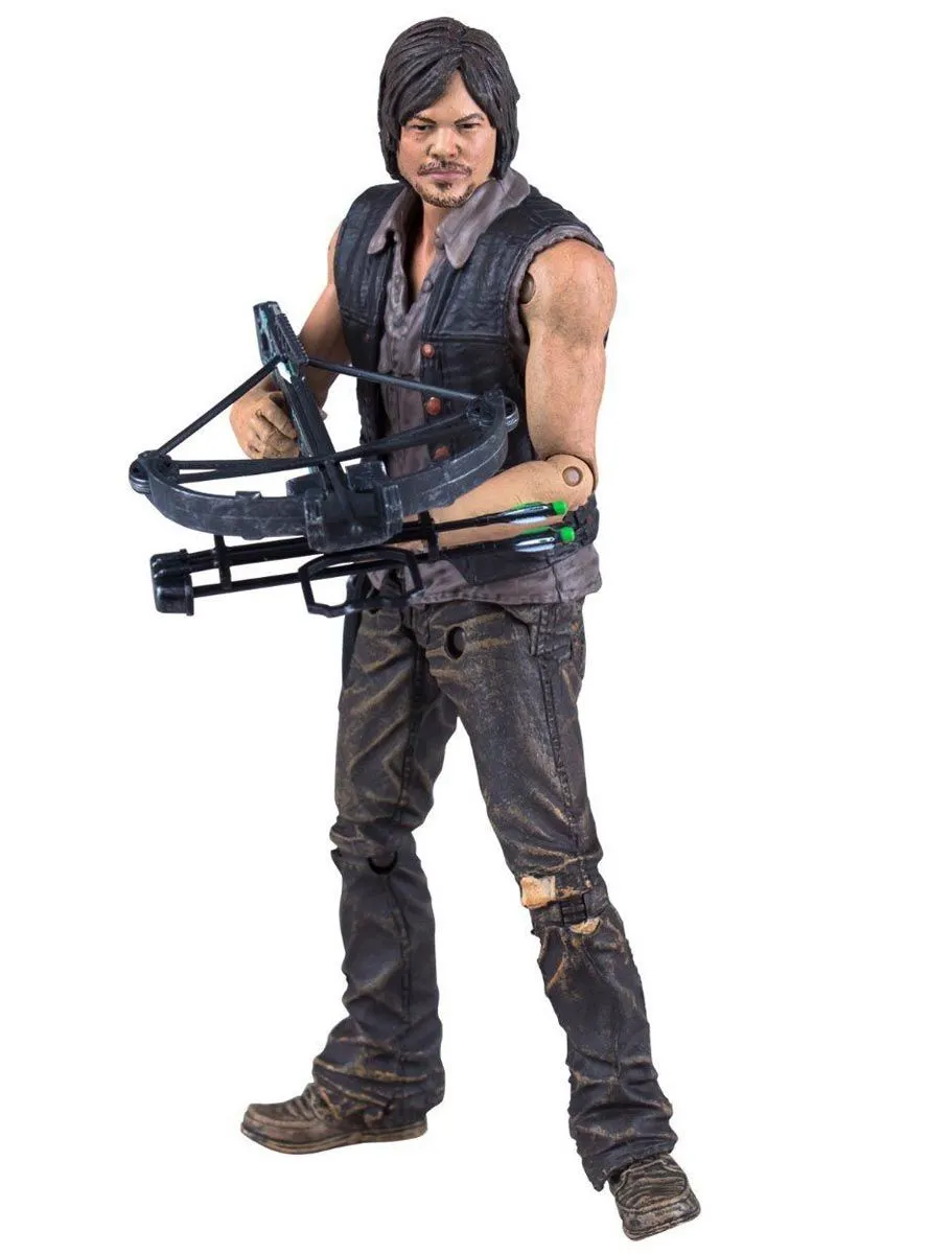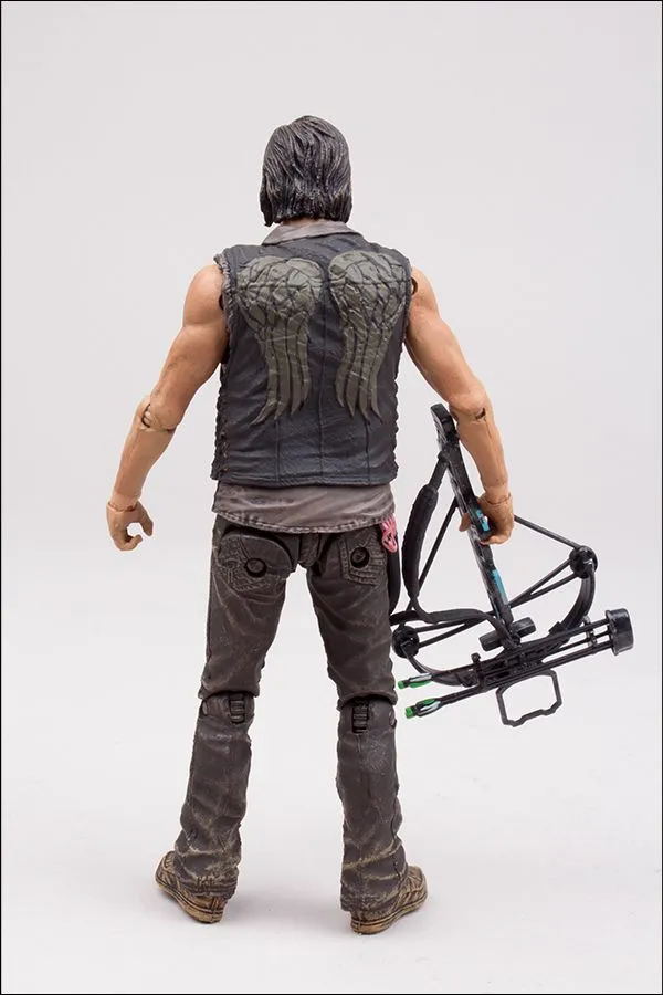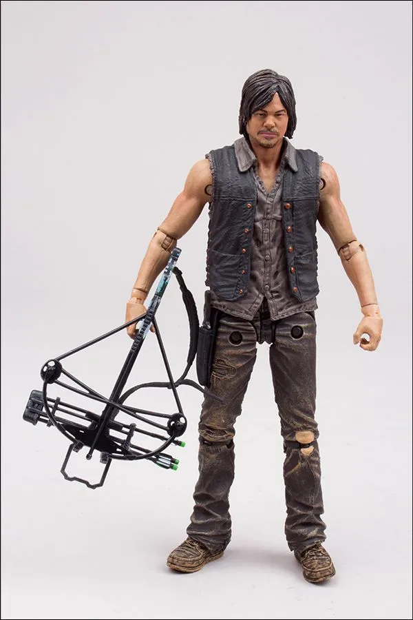 Die bewegliche Figur von Daryl Dixon kommt mit seiner Biker Weste, Jagdmesser und Armbrust.