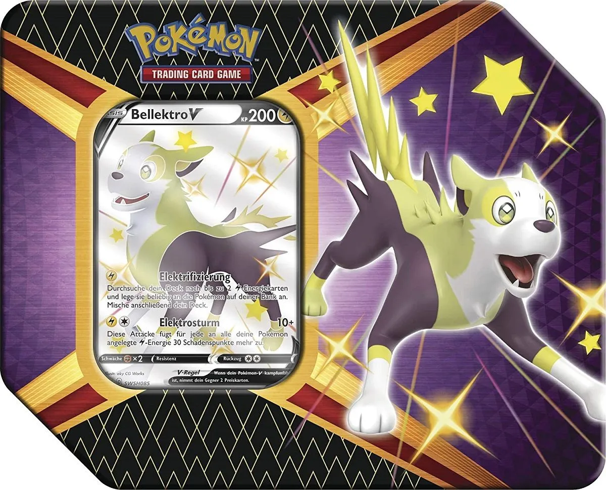 Pokémon Tin-Box der Erweiterung Glänzendes Schicksal Bellektro in Deutsch. Kräftig leuchtende und Schillernde Pokémon! Die Schillernde Schatzkammer ist voller unverwechselbar gefärbter Pokémon, einschließlich drei besonders schöner Exemplare aus der Galar-Region! Wähle die flauschige Power von Cottomi-V, die Stromblitze von Bellektro-V oder die Wassergeschosse von Urgl-V in der Tin-Box Glänzendes Schicksal des Pokémon-Sammelkartenspiels. Jede dieser fantastischen Tin-Boxen enthält ein supermächtiges (und Schillerndes) Pokémon-V, das dich mit seinem Aussehen, Wagemut und seinen Tricks in deinem nächsten Pokémon-Kampf bis an die Spitze bringen wird!