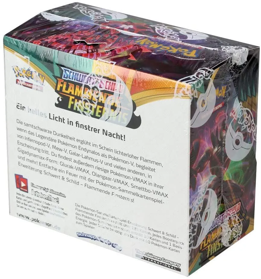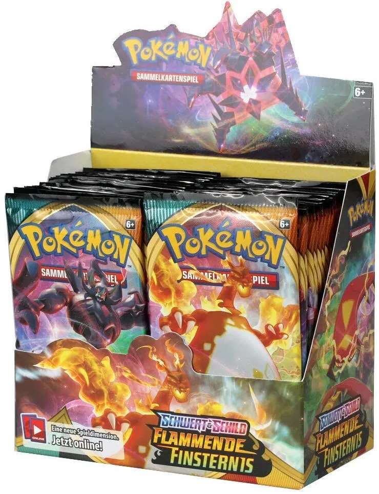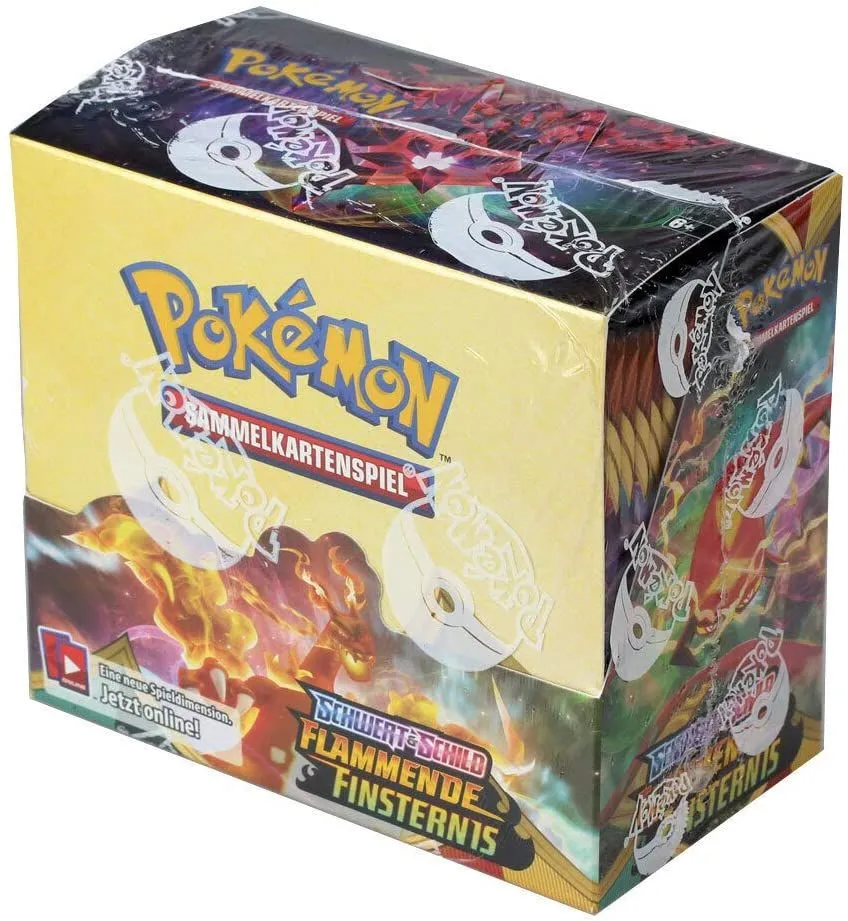 Pokémon Booster Display der Schwert & Schild Serie „Flammende Finsternis“ in Deutsch.