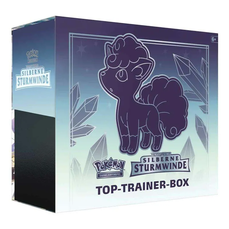 Die Pokémon Top-Trainer Box der Edition Schwert & Schild: Silberne Sturmwinde in der deutschen Ausgabe.